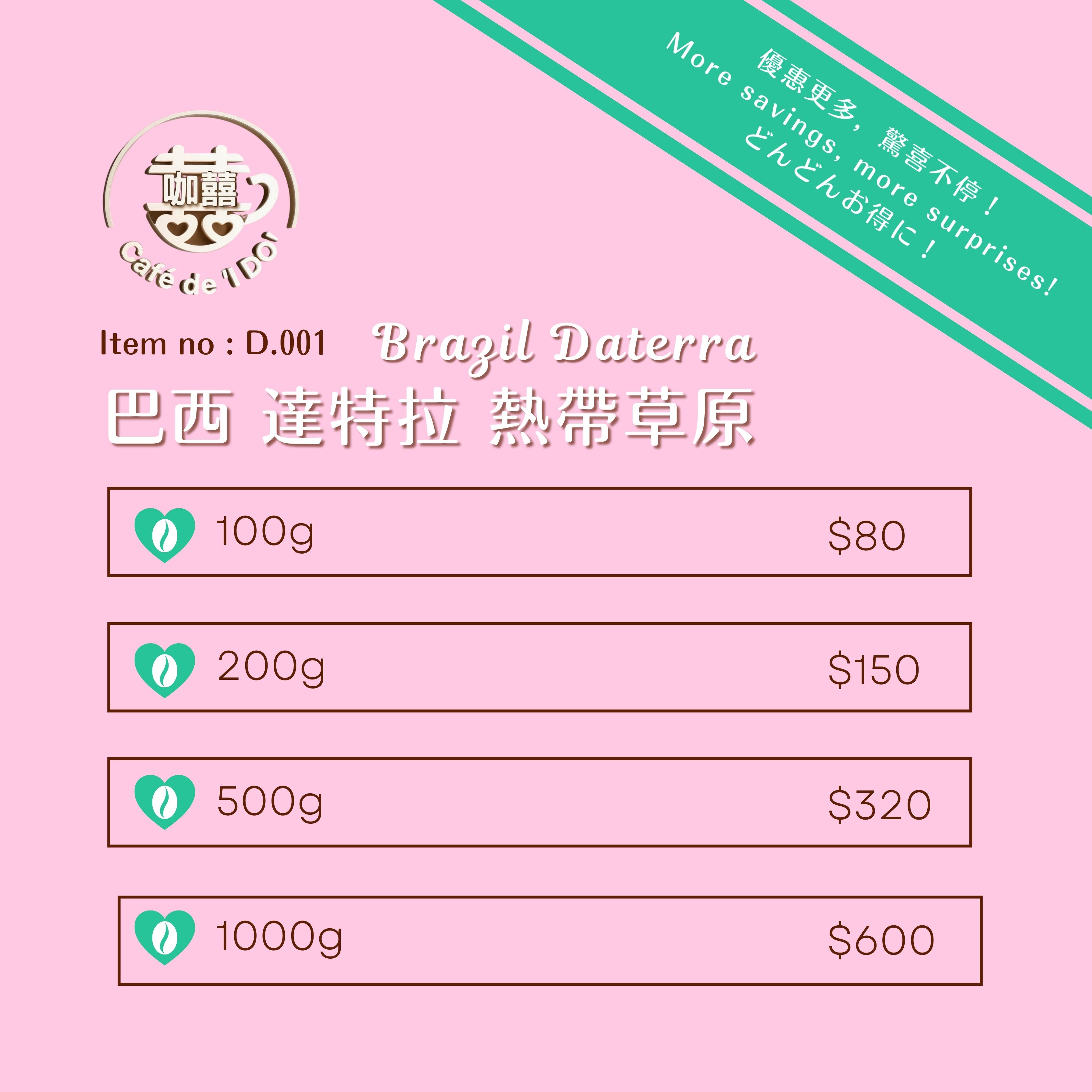 規格:16/18目 產區: 巴西,達特拉莊園 (Daterra Estate) 海拔:1,150 公尺 處理法:日曬處理(Natural Process) 風味:核桃、可可、胡桃
